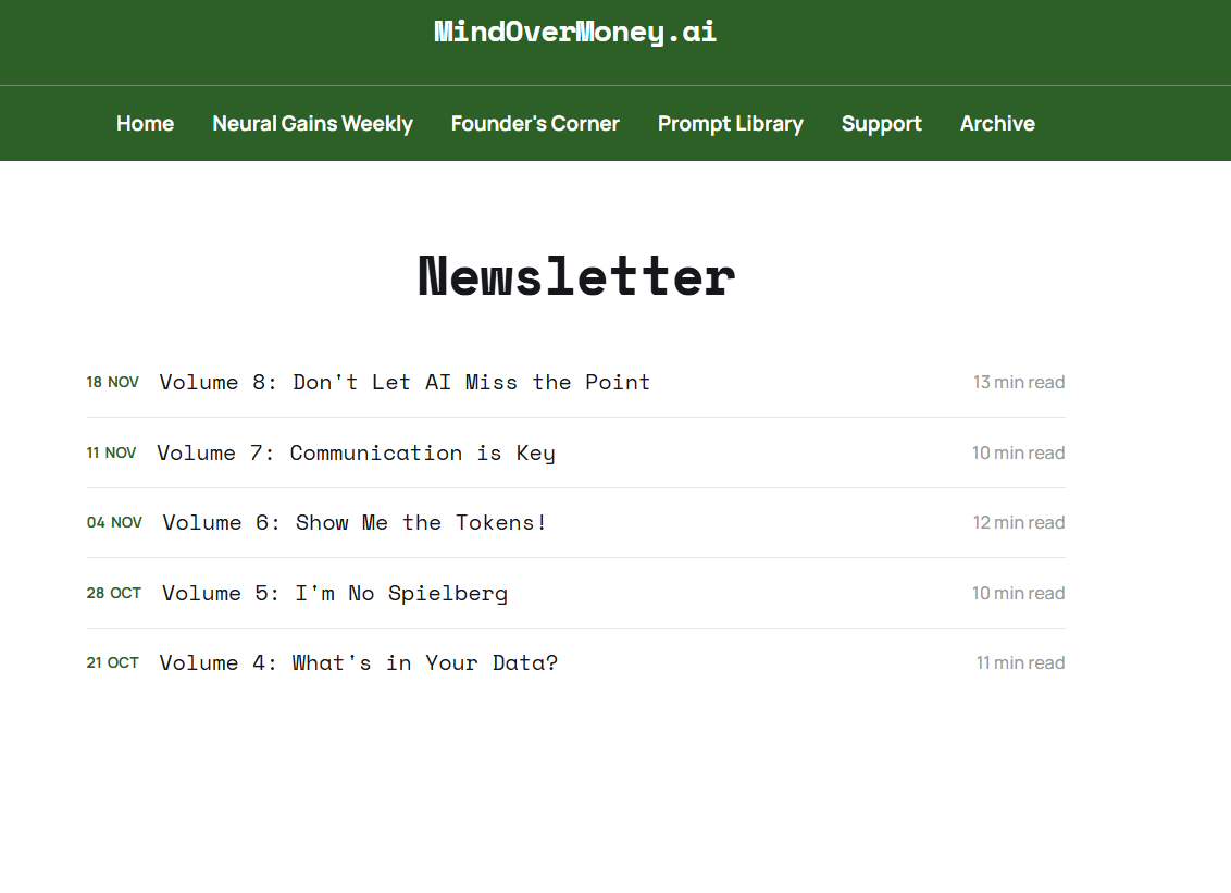Two things can be true at the same time. AI can transform how you work, while also requiring the proper governance to ensure accurate outputs. As I highlighted in Volume 2, I’m constantly working with AI tools to close knowledge gaps and build code to customize the experience on MindOverMoney.ai. This process keeps getting more efficient as the intelligence of large language models expands. But that doesn’t mean you can let AI write code, solve problems, generate answers, and help you work without governance in place. I want to walk you through my latest challenge and how AI saved the day, but only with my oversight.