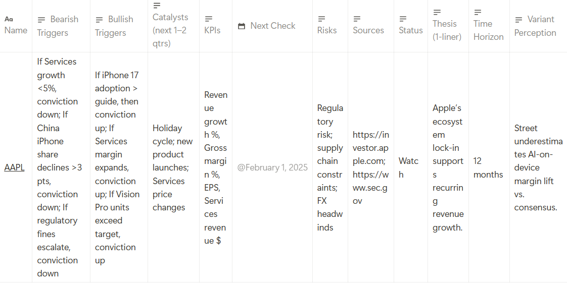 Because collecting facts is easy — turning those facts into repeatable conviction is the real edge. This workflow will show you how to convert one Perplexity brief into a reusable Notion Watchlist Thesis Card you can update every quarter to see how your thinking evolves.