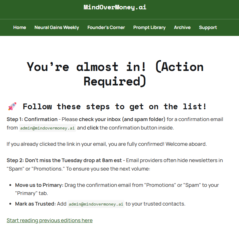 This solves the visibility problem completely. Previously, a user would sign up and stay on the homepage, likely missing the confirmation message in their spam folder. Now, the workflow is impossible to miss. A user signs up, is immediately moved to a page that says "Check your spam folder," finds the newsletter to whitelist it, and is reminded again to add us to their contacts upon confirmation.