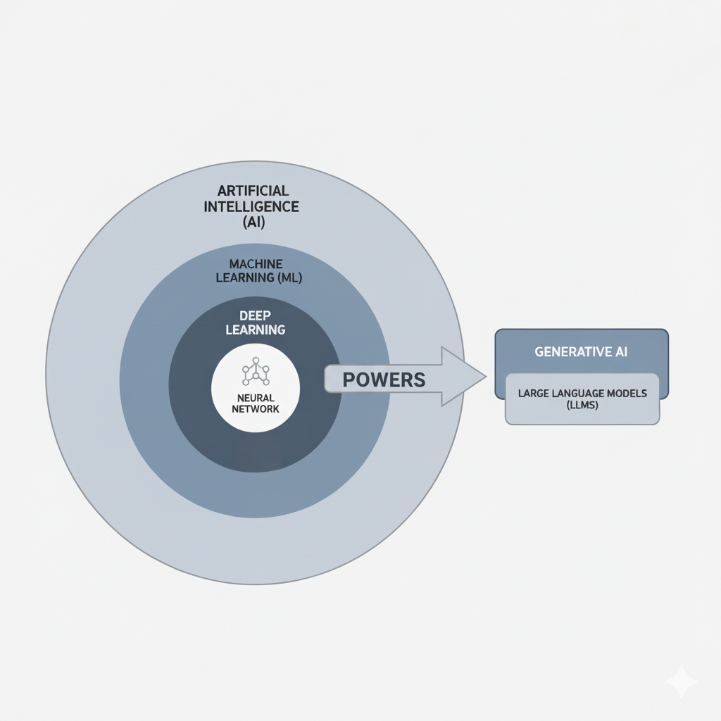 Last week we built the map—Artificial Intelligence → Machine Learning → Deep Learning—so you could spot what’s hype and what’s real. This week we go one level deeper: inside the engine that makes modern AI learn, the capability that lets it create, and the text specialist you’re already using. By the end, you’ll understand how today’s “AI features” actually work—and when they’re useful for your life and money.