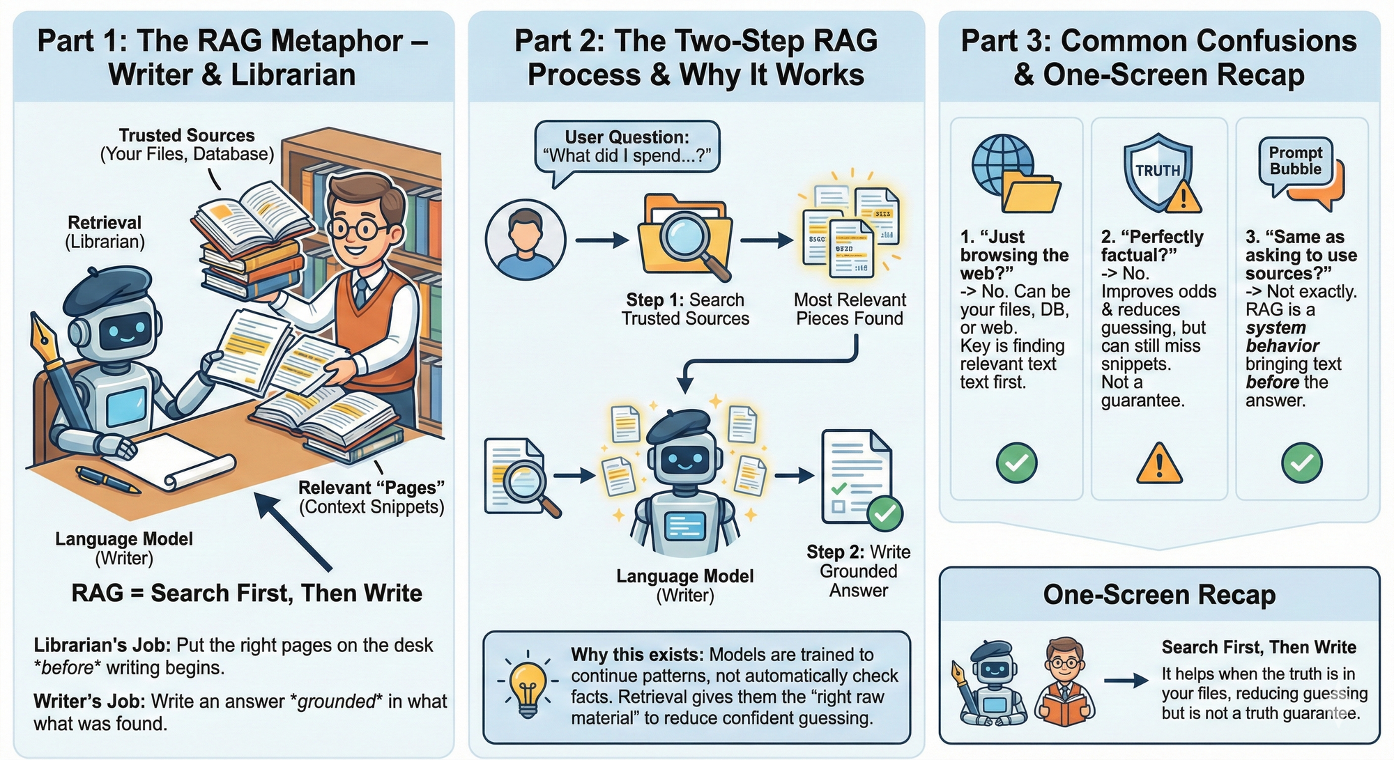 Common confusion 1: “Is retrieval just browsing the web?”Not necessarily. Retrieval can be over your own files, a database, a knowledge base, or the web. The key idea is the same: find relevant text first, then write.