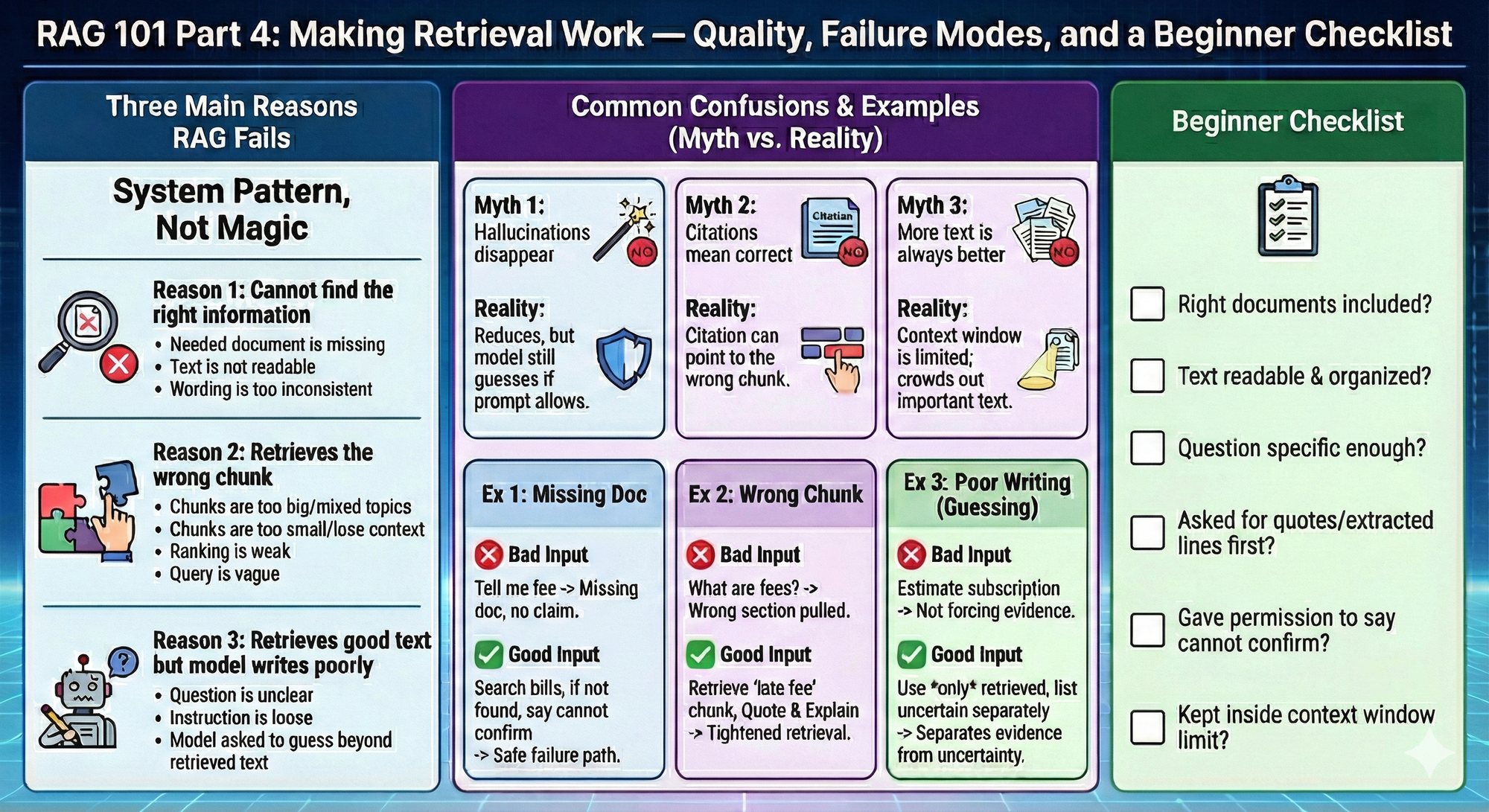 Retrieval-augmented generation is not a magic wand. It is a system pattern. When it works, it feels like the model âfinally got smarter.â When it fails, it usually fails in predictable ways. This final part gives you the beginner mental checklist to recognize what went wrong.